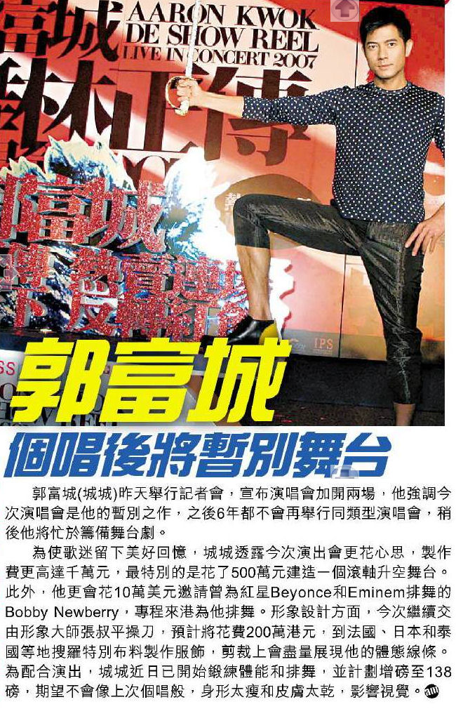 Aaron Kwok de Show Reel Live in Concert 2007 [November 17th – 23rd & public tickets selling starts Oct 3rd.] is not only laborious for him but an expensive production. To make a new dancing breakthrough, dance instructor Bobby Newberry, who is known to have choreographed Beyoncé & Eminem, is invited to choreograph for Aaron. The cost is US$10,000 (or approximately HK$80,000) .