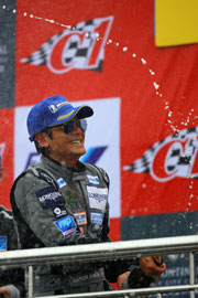【20:57】2009年09月12日 【on.cc專訊】 郭富城出席成都舉行的賽車比賽,成功力壓多位賽車手以大熱姿態勝出,站在冠軍台的城城興奮得將香檳射上觀眾席,城城說:「今次個賽道彎位好多,本身已經比較驚險,加上落雨,今次真係水戰成都。」