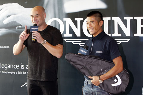 American Andre Agassi, left, Hong Kong singer Aaron Kwok and American Pete Sampras pose before a friendly exhibition at the Venetian Hotel in Macau Sunday, Oct. 25, 2009. The two tennis greats revisited one of the sport’s greatest rivalries in the 1990s. They last played in the U.S. Open final in 2002.