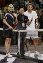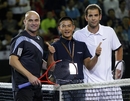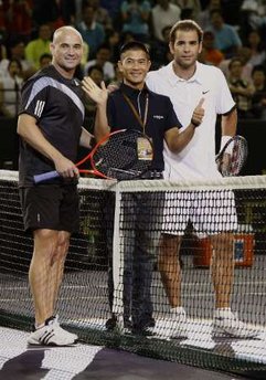 Hong Kong actor Aaron Kwok (C) poses with Andre Agassi (L) of the U.S. and compatriot Pete Sampras before their exhibition tennis match at Venetian Macao in Macau October 25, 2009.