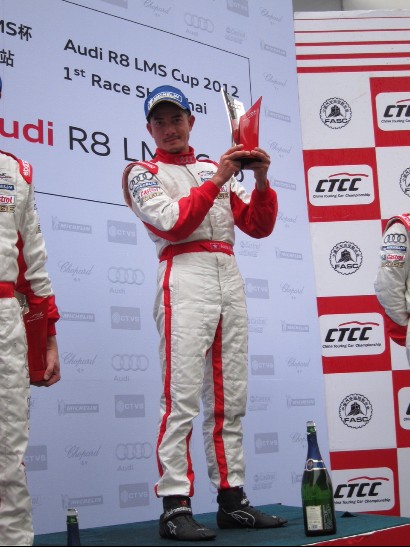 [21:04] 2012/04/29 【on.cc 東方互動 專訊】 熱愛賽車的郭富城(Aaron)現身上海出戰《Audi R8 LMS Cup》賽事,他以一身紅白色戰衣上陣,最後奪取冠軍!網友祝賀Aaron,他亦作出回覆:「謝謝大家支持我賽車,繼續努力!」不過,有粉絲指因比賽時下雨,而Aaron在能見度極低的情況下亦不慎與其他車發生輕微碰撞,幸好並無大礙。