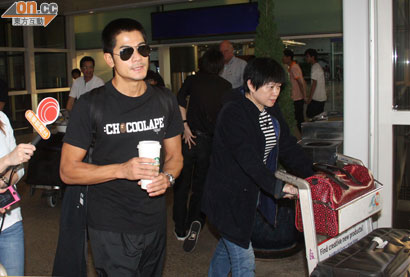 [19:17] 2012/04/09 【on.cc 東方互動 專訊】 郭富城傍晚現身機場,剛由北京出席完《2011中國電影導演協會2011年度表彰大會》返港,一身黑衫、黑褲、黑超的他,甫出閘即前往買咖啡品嘗,期間有遊客認得郭天王,一一舉機影相,城城說:「我復活節要開工,喺濟南做完嘢至去北京。(返港出席金像獎頒獎禮?)應該唔會。」