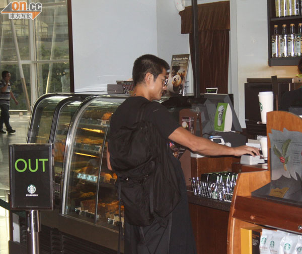 郭富城黑衫、黑褲、黑超甫抵港,即買咖啡品嘗。